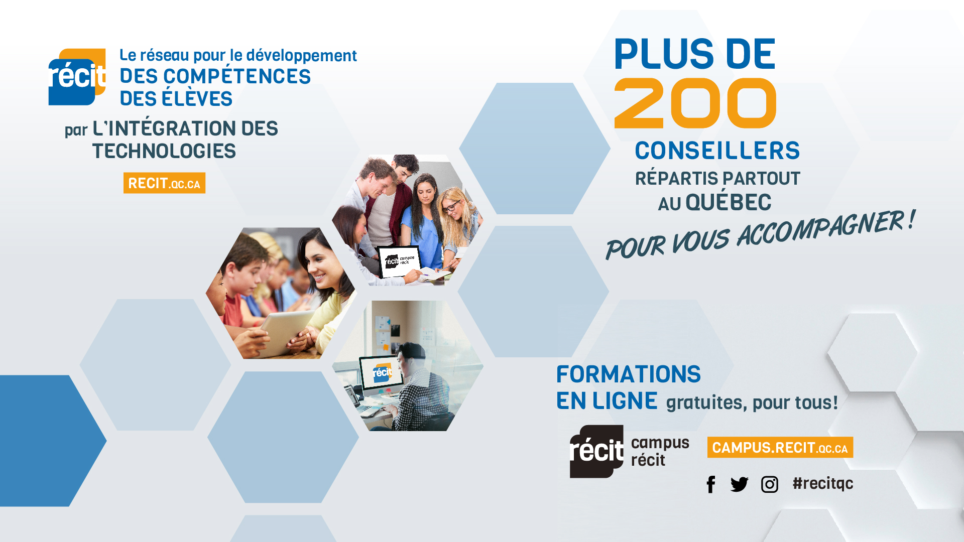Le RÉCIT est un RÉseau axé sur le développement des Compétences des élèves par l’Intégration des Technologies. C’est principalement par la formation, le soutien et l’accompagnement du personnel enseignant que le RÉCIT réalise ce mandat, tout en développant une culture de réseau et de partage.